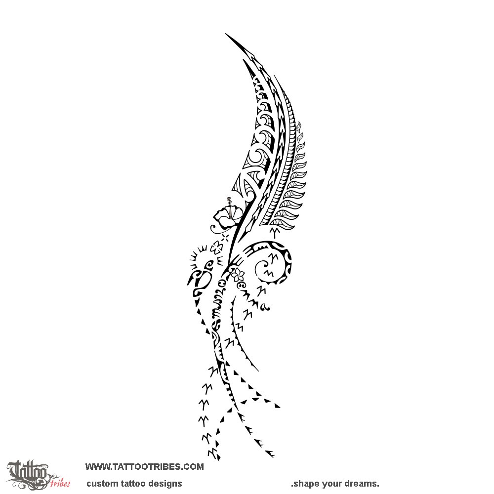 Below the fern, the flower of hibiscus is a symbol of carpe diem, living every moment fully, with a Marquesan cross disguised in it for harmony.
