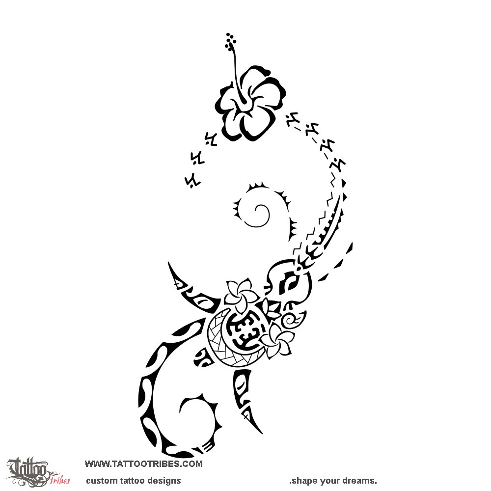 This feminine Polynesian tattoo for the ankle represents Pavla´s family as the central turtle, with her and her husband on the shell between a braid and flax leaves (family union), protecting their two children (the frangipani flowers) under the front flippers (shaped like two protector tiki).