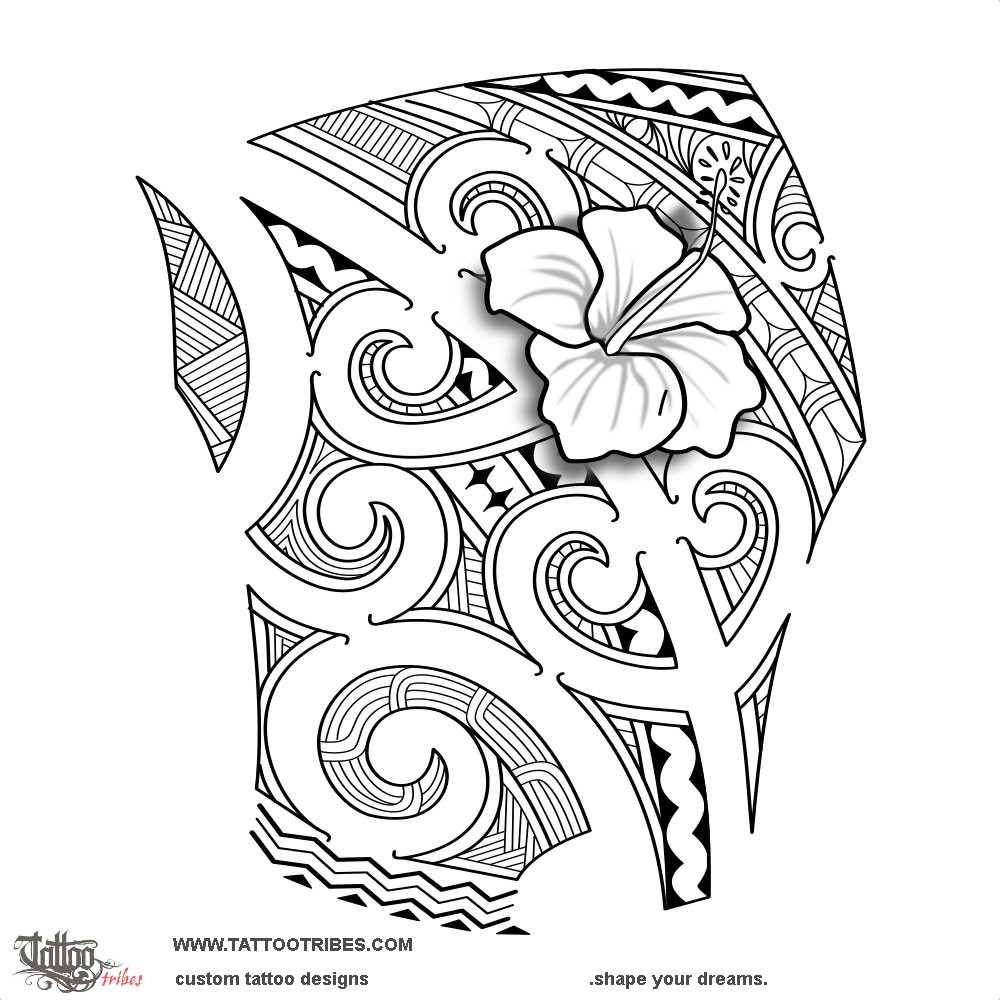 This kirituhi Maori style tattoo was designed for Solomon to integrate a matching existing part, and it has a hibiscus flower centrally in realistic style with shades to blend in with the thin lines of the rest while yet sticking out.