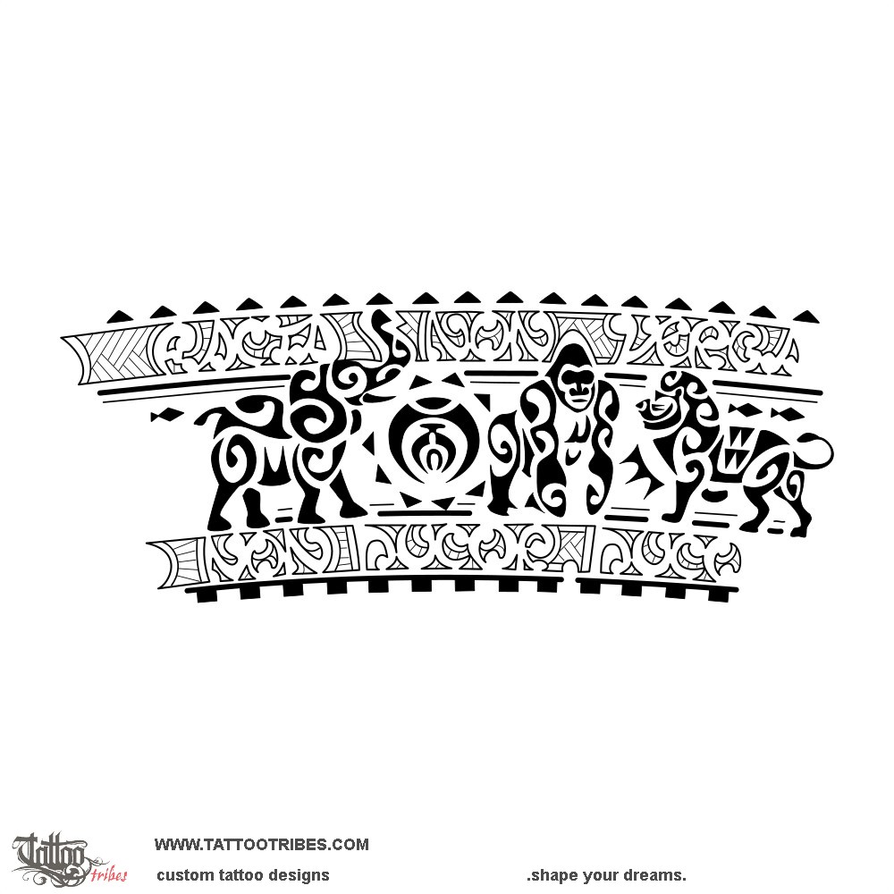 The central part includes three animals designed in Polynesian style to match the rest of the tattoo: an elephant, a gorilla, and lion.