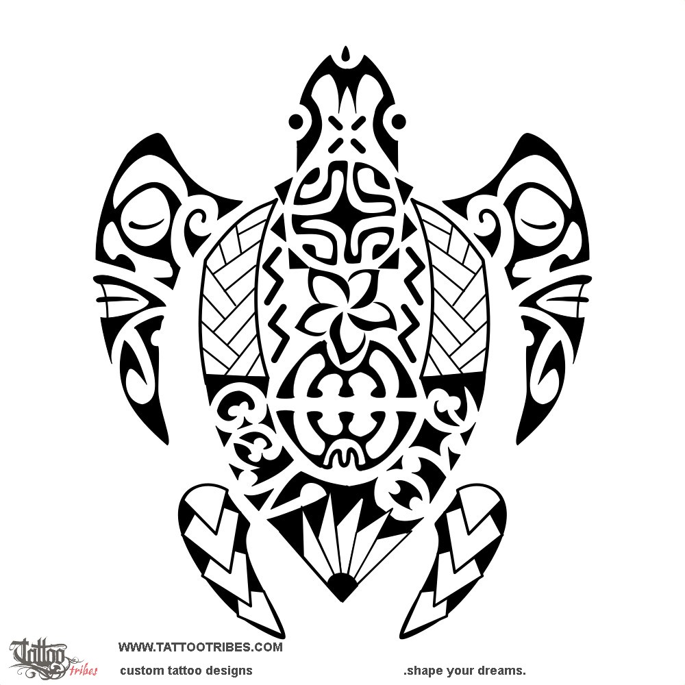 The front flippers of this Polynesian turtle tattoo prepared for Markus are shaped by two tiki to protect his family in the middle, and they include fish hooks for prosperity, while the back flippers are spearheads representing his willingness to fight for them.