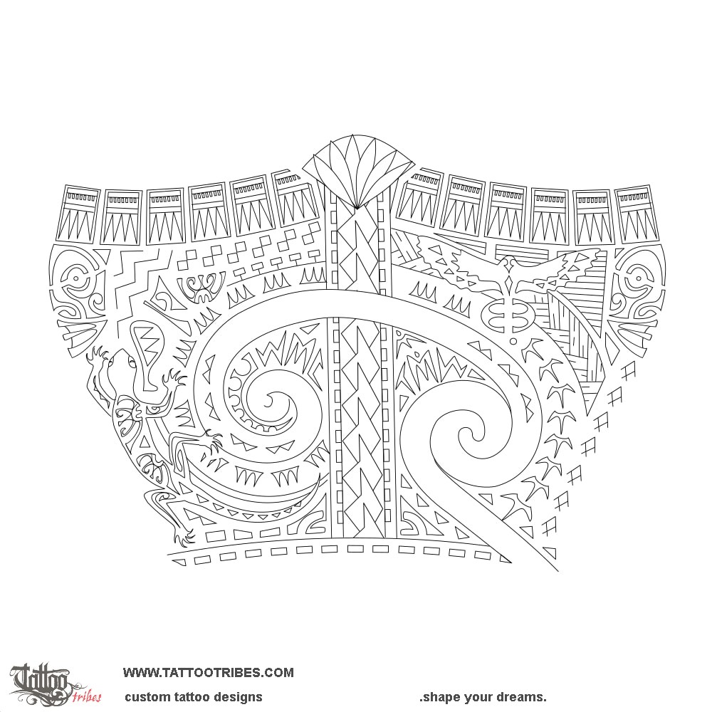 The lizard and the two tiki on the sides protect family, while the path to knowledge, the adze, and the mere represent the values they teach to their son: honor and respect, skills and creativity, and service supporting people through their challenges (the path of Kamehameha).
