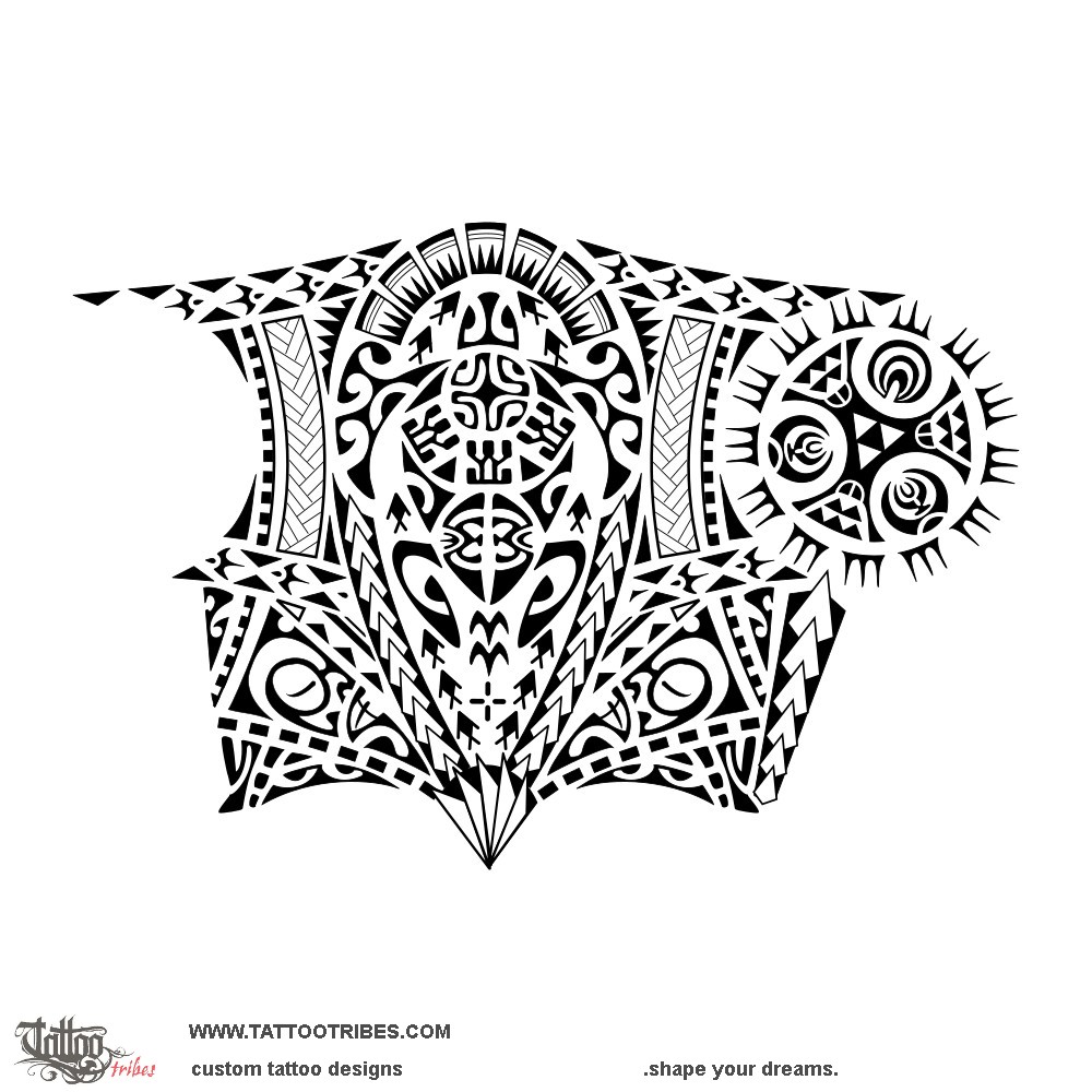 On the front, a turtle represents his family as a place of harmony (the Marquesan cross), union (flax leaves and braids), and mutual support (the chasing birds).