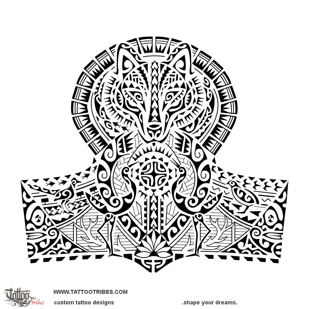 On the sides of the wolf there are two lizards in a circle and elements for prosperity (fish and fish hook, coconut leaves) shaping a bigger sun around the shoulder while stepping stones going all around the arm at the lower edge symbolize achievements, and the two tiki on the sides bring protection from all directions.