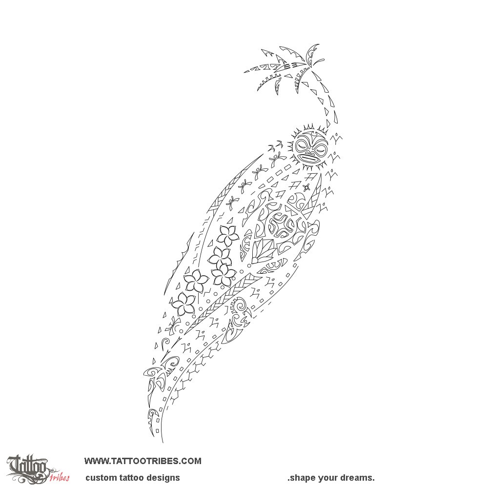 This Polynesian tattoo for the outer thigh going from knee to hip was prepared for Sharon and it represents her story.