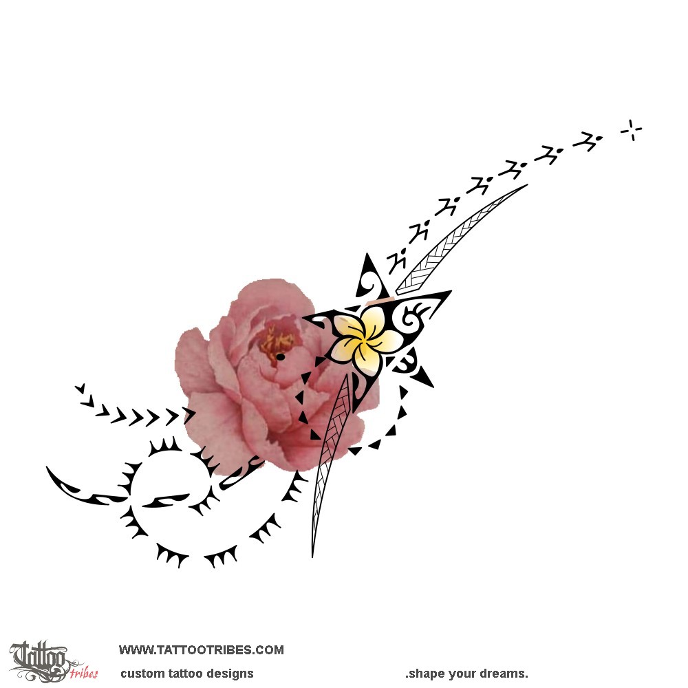 Within the star we added a koru and a frangipani flower for her daughter, a seashell (faithful love), and tiki hand and eye for protection, while a braid for family unity and a sun for joy connect both star and flower.