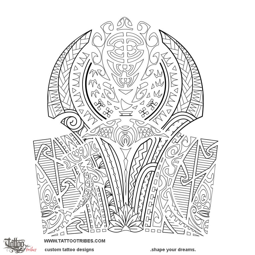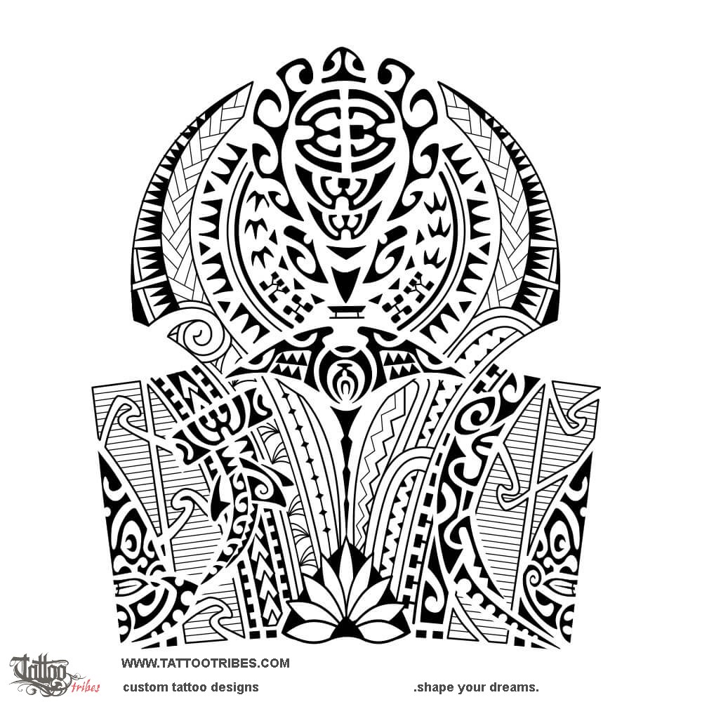 The turtle representing family is central on top, surrounded by a sun for joy, braids for union, and coconut leaves for prosperity covering the whole shoulder.