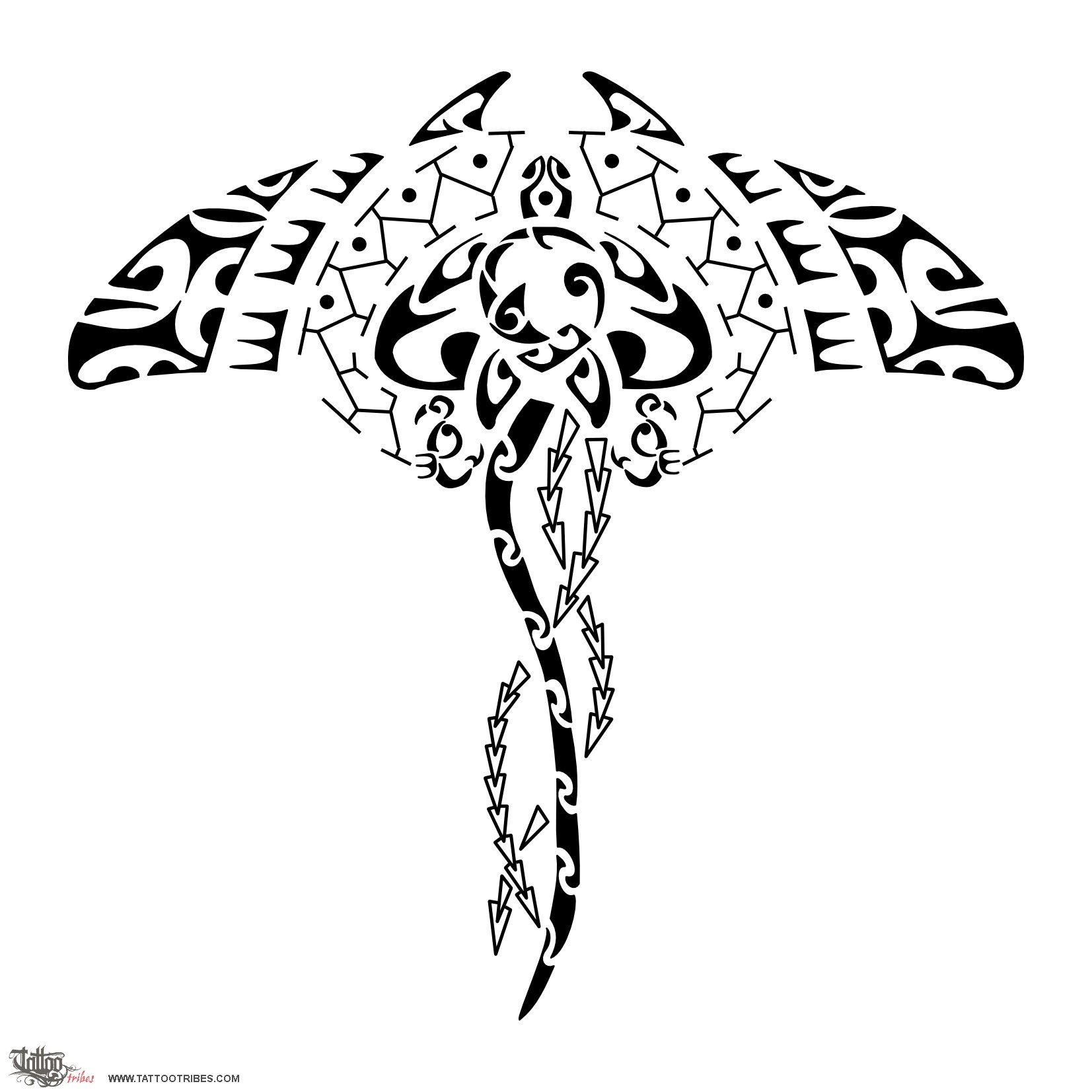 This tattoo is mainly about water and bonds. Despite the simple look, there are many symbols and meanings related to this design. Water is surely the main character in this, as many symbols are related to that: the manta (protection, freedom and elegance) that gives the general shape, the jellyfish (calm, equanimity) inside the manta, containing a turtle (family) that has a hammerhead shark (determination, strength) and a koru (a son) on the shell. The spots (islands) along the honu shell motif (the traveller) are a wish for travelling among the islands, on the sea, even if the central point, the very own island, remains family. Shark teeth are for adaptability, and the darker tentacle of the jellyfish with a symbol for bonds, which remains behind, represents friends lost along the way, but still carried along by the thread of memory. Manaias are guardian angels, and outer tikis protect from every side.
