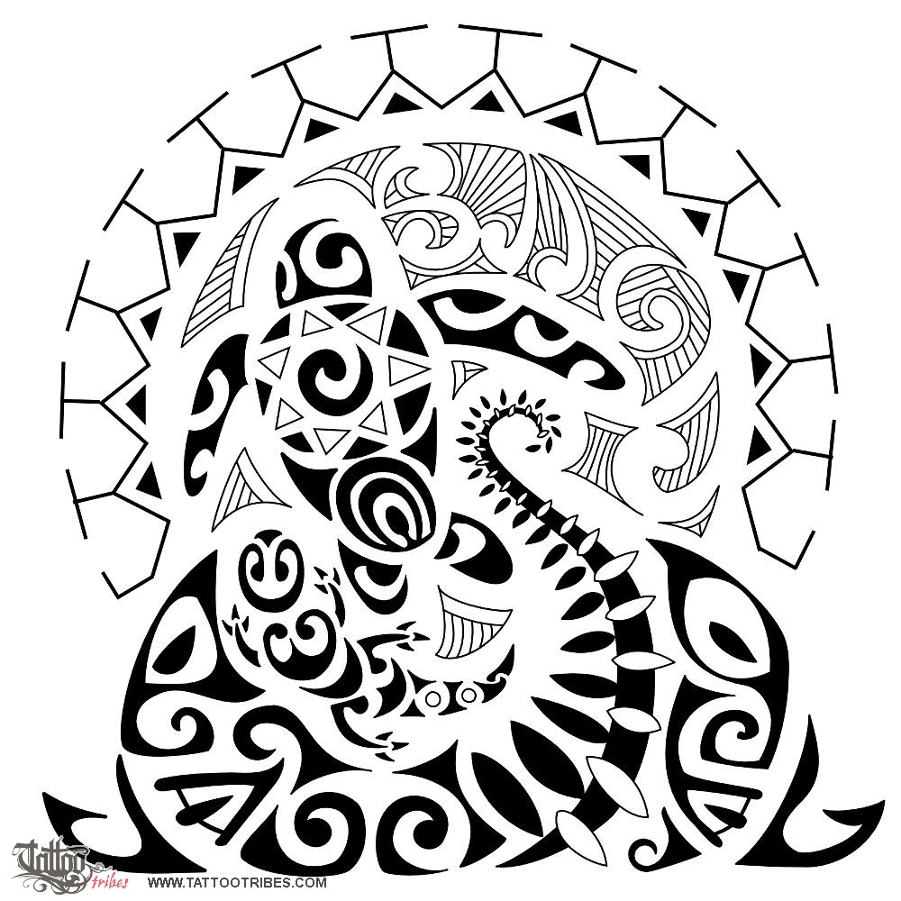 Polynesian tattoos explainedThe bigger sun contains the whole design as a wish for eternity and long lasting, and in the middle the turtle symbolizes the importance of family, and of his son (the koru on the shell inside the smaller sun), reached at the end of a maturation path.