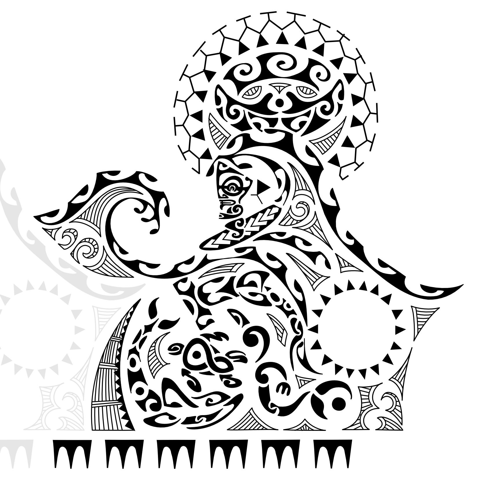 The dolphin, hammerhead shark and fern surrounding it indicate joy, determination and responsibility; the manaia is the guardian angel protecting it.