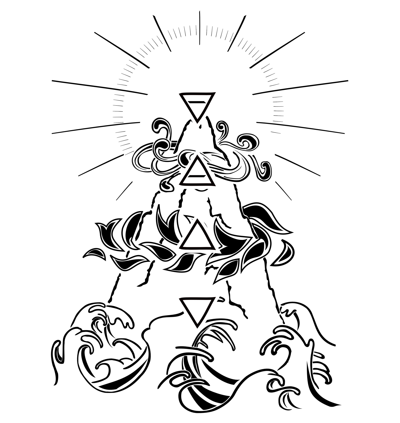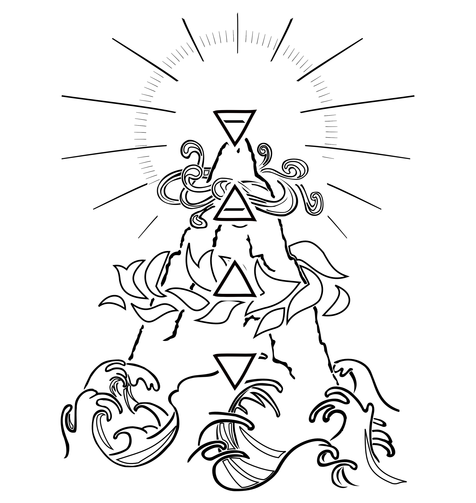 Elements, in this case the four classic ones in western cultures(earth, air, water and fire), are strictly connected with each other, in a balance that´s the basis of everything. The symbols inside this design are the symbols of the 4 elements themselves. This version is particularly fit for irezumi styled colouring.