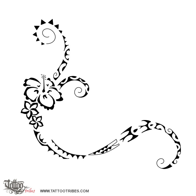 On the other side, going upwards past the ankle, the hibiscus flower symbolizes beauty and femininity, and it represents Chiara, close to her two children (the two frangipani flowers), and going beyond them the waves take on the idea of the neverending changes of life, whilst the sun represents joy and positivity.