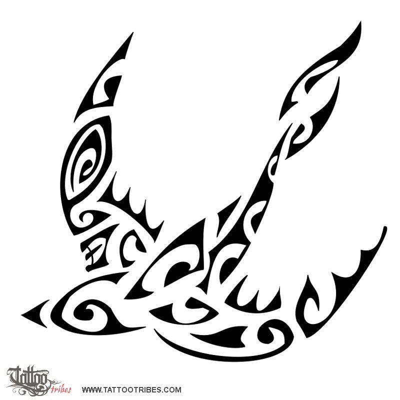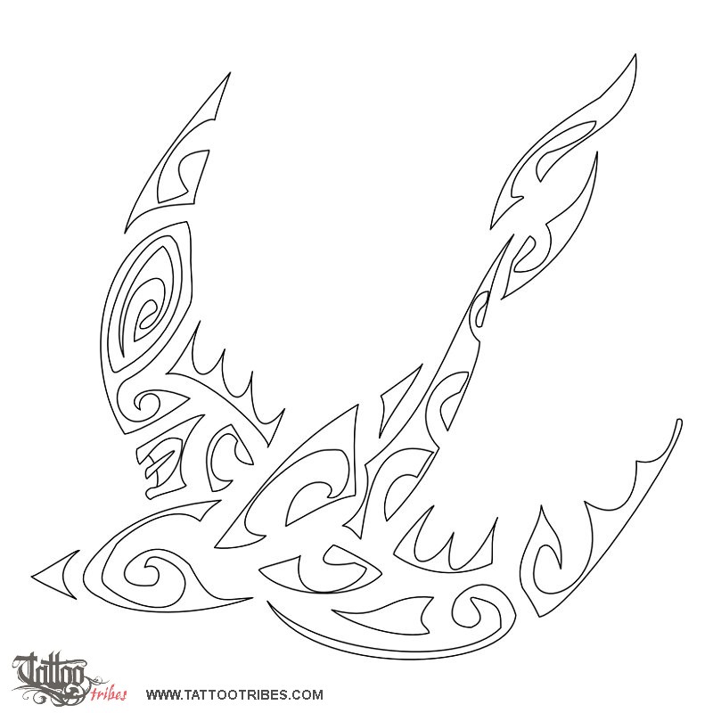 The body is made here by the body of a shark, symbolizing adaptability and strength, quality enforced by the stylized shark teeth in the wings; the tiki represents protection, the koru a new beginning, a new life, and the fish hook is for prosperity.