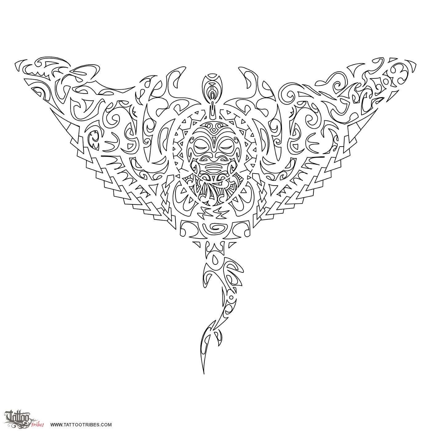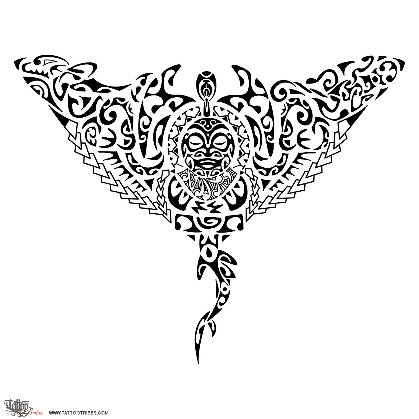 The central part of the manta ray includes a turtle, symbolizing family and long life, with the shell made of a tiki (protection and fertility) surrounded by a sun (eternity and joy). Below the name, the two birds following each other symbolize how Paul will always be there to help is daughter, and the stylized hand right below is to indicate he will always give her a hand whenever a hand is needed.