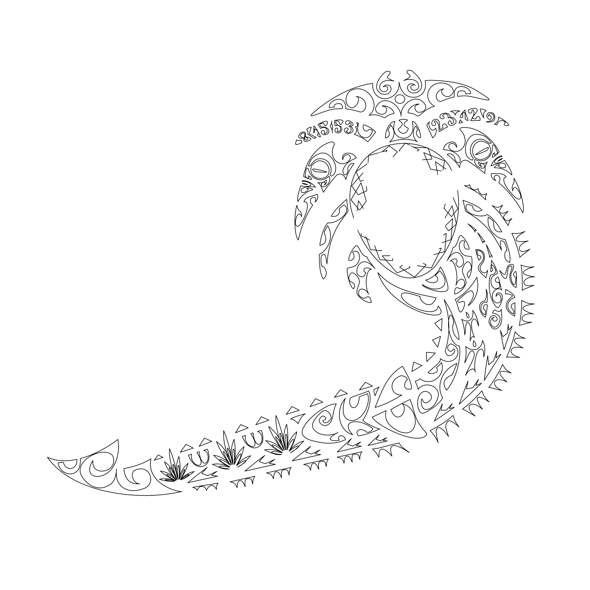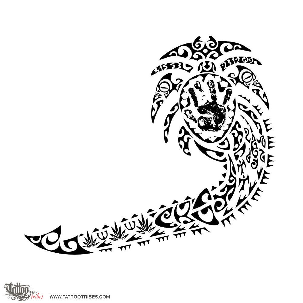 The flippers of the turtle, the waves and the manta above (freedom, beauty and protection) are positioned to resemble the leaves of a palm that has a shark (adaptability, guide) as its trunk. Palm trees symbolize abundance and prosperity, like the fish hooks placed at the tip of the front flippers; the ending part of the armband itself recalls a fish hook as a wish for prosperity to always follow the family.