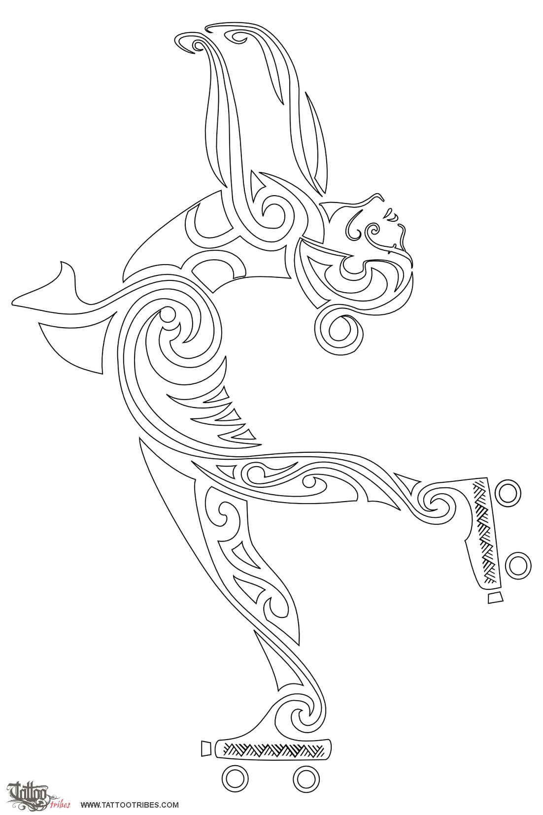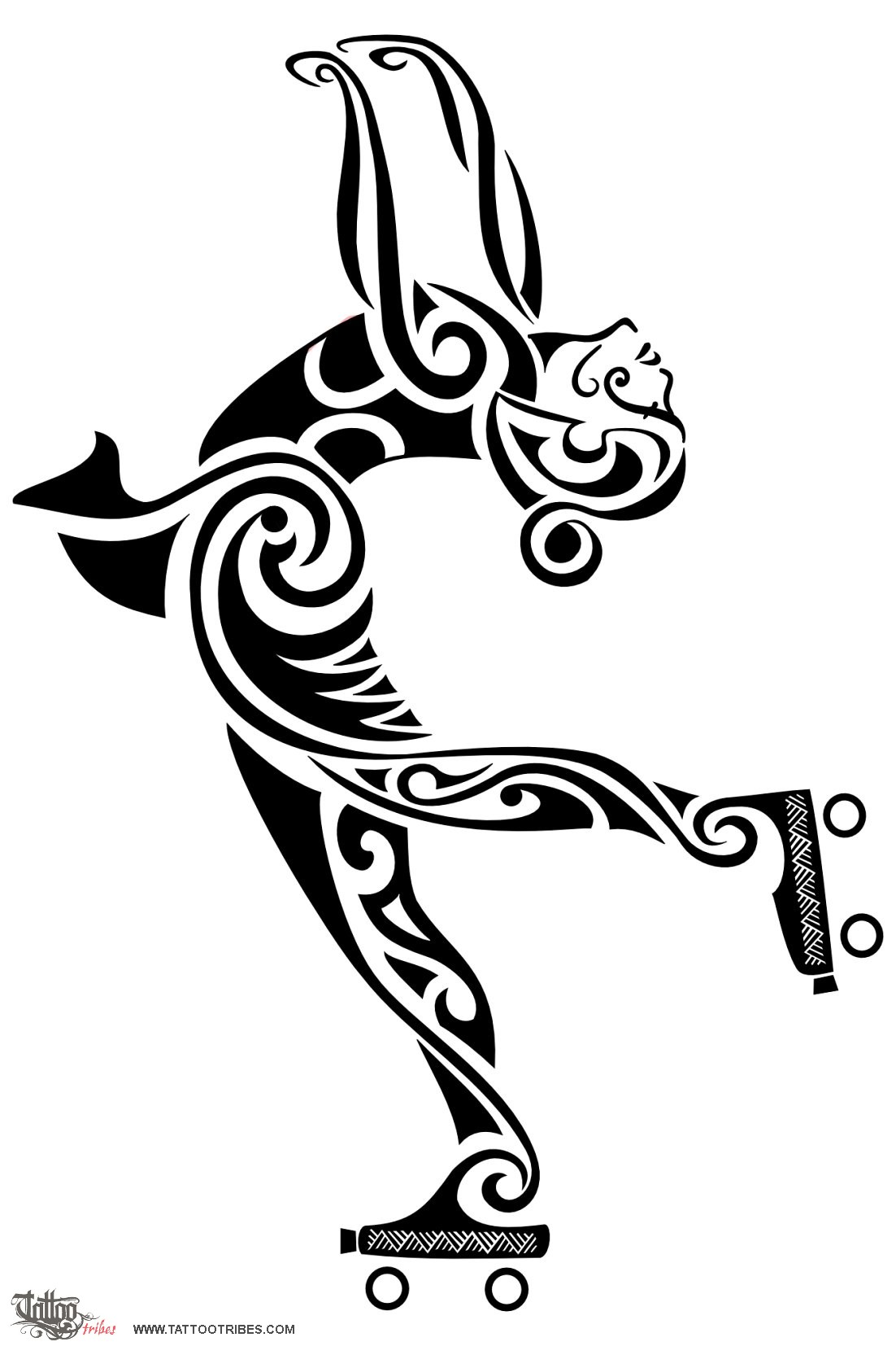 Simone asked for a Polynesian styled tattoo of a girl on rollerskates. We tried to integrate Maori elements into the tribal design with the idea of keeping her movements and harmony throughout the final design.