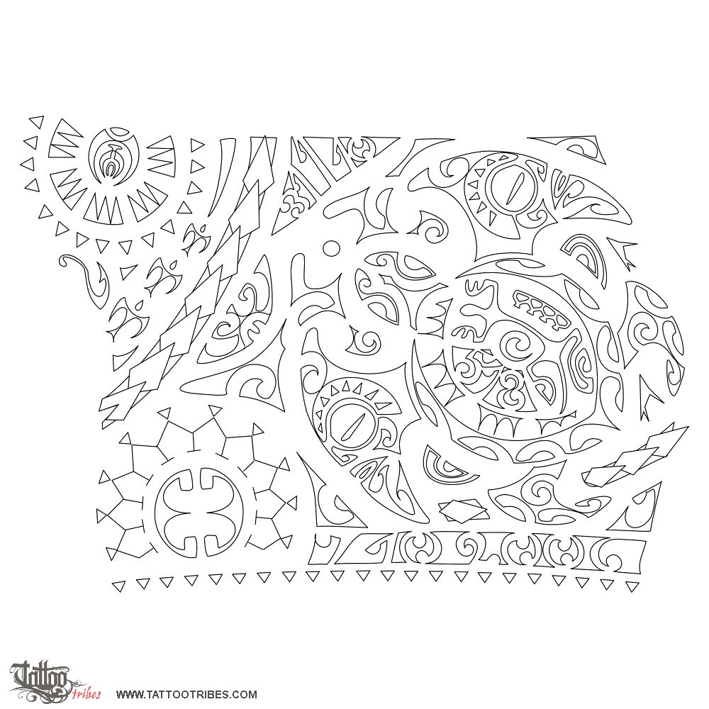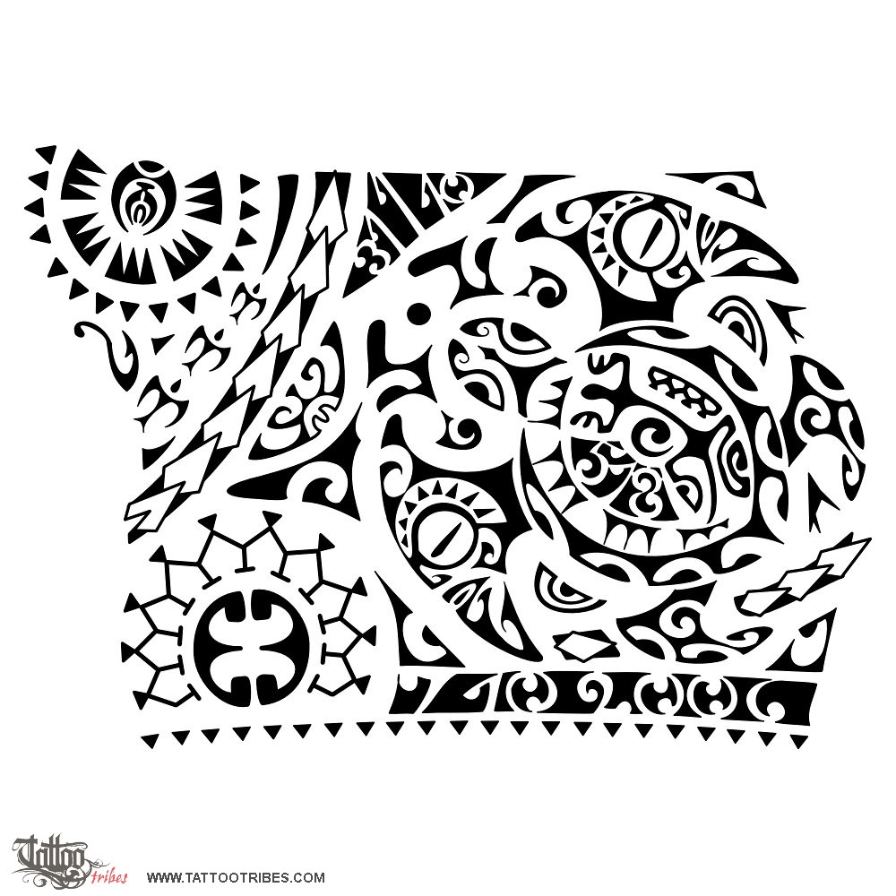 Polynesian tattoos explainedThe double symmetrical symbol centered in the lower left sun symbolizes the couple, marriage, surrounded by the sun as a symbol of eternity, positivity and joy; beside the sun, above the shark teeth motif (adaptability and protection), a maorigram reports the date of his wedding: 7 10 2006.