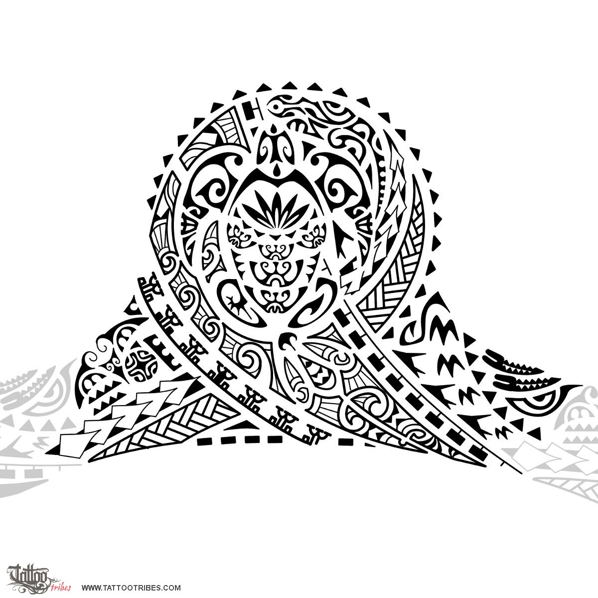 Centrally on the shoulder we placed a turtle, to symbolize the importance of family for Michael, who requested this tattoo. The front fins of the turtle are tikis to protect his family from all sides. The lower element on the shell of the turtle represents him, with his wife nearby. He supports his wife and together they support their three children just above. Their union gives stability to the family (the mountains on the sides) and joy (the sun above the five of them, incorporating a flax plant with five leaves which is yet another way to represent family). The two chasing birds closing the upper part of the shell and making the head of the turtle symbolize that help will always be granted to the dear ones.