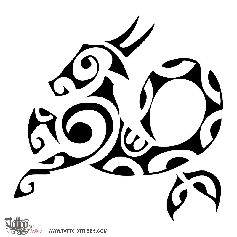 Capricorns are depicted with body and head of a goat and fish tail, representing their double nature, both creative and practical. In this drawing the waves are the main element symbolizing its mutability, with korus symbolizing life and new beginning.
