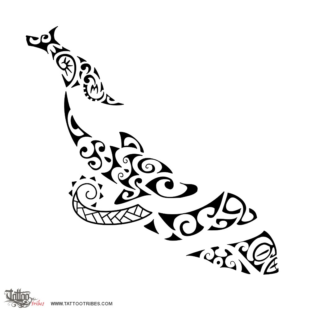 A wolf head was stylized in the tail as a symbol for loyalty and there is a seashell next to it to symbolize love and safe shelter, intimacy, protected by the manaia forming the other tip of the whale tail.