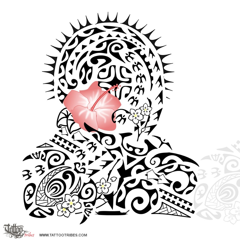 Main elements of this half sleeve tattoo are the flower of hibiscus (living every single moment of life, carpe diem, the island vibe) joined by cherry flowers, which have a very similar meaning. They´re here together to symbolize that different cultures can go together in harmony (the Marquesan cross in the center, balance and healing).