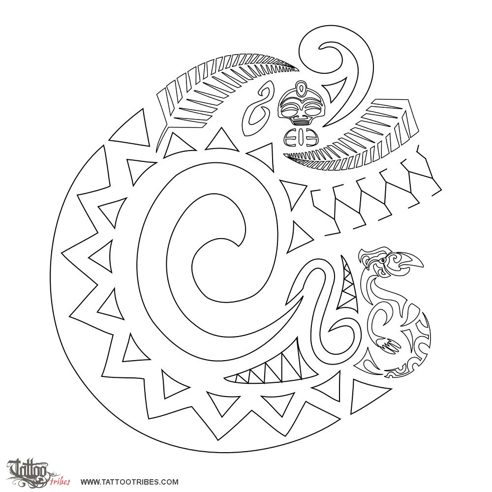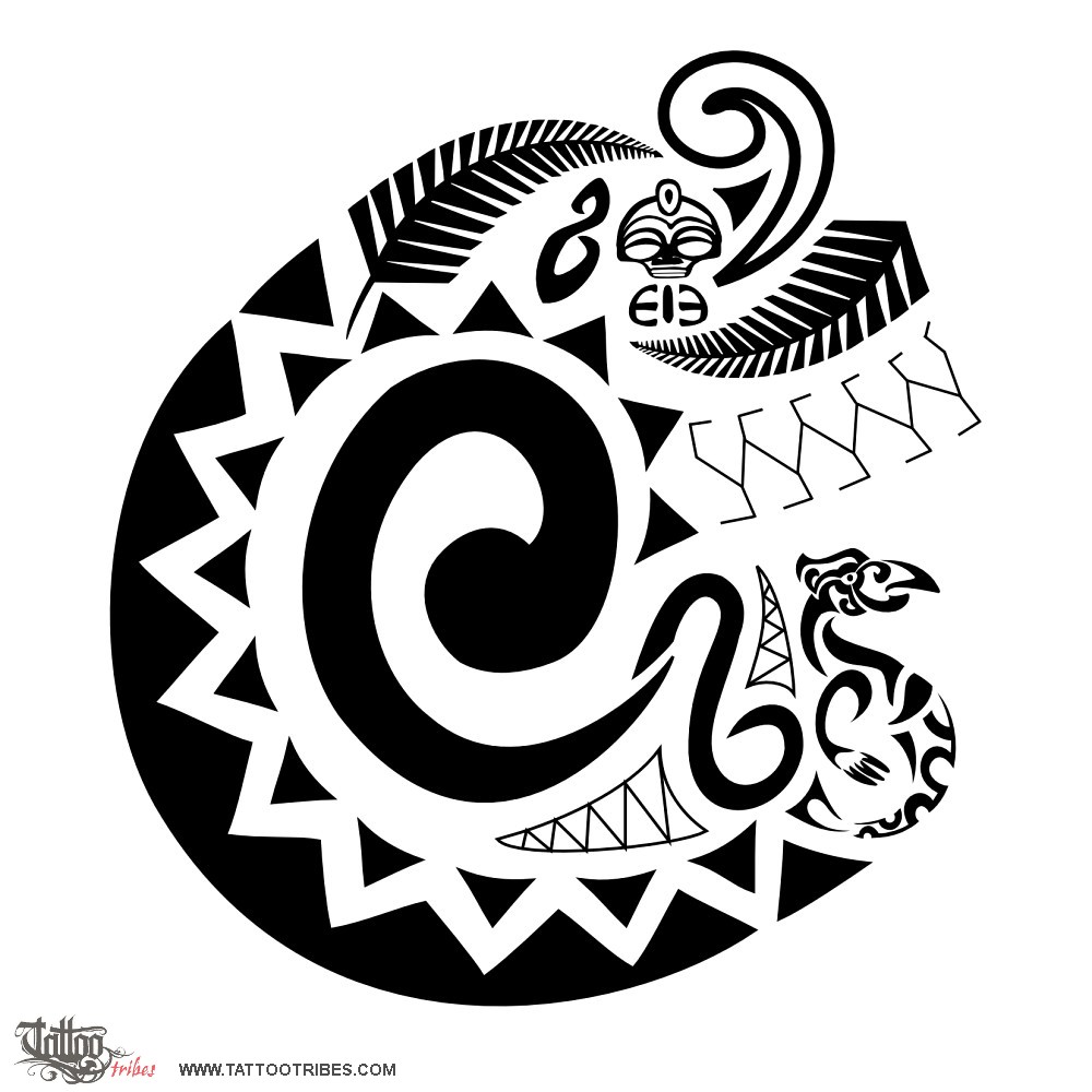 This tattoo, requested by Clemente, represents some important moments in his life, clockwise from the bottom: from the darkness, helped by the manaia, or guardian angel, to the sunlight, with the zodiac sign of the lion becoming a koru, symbol of new life; reaching maturity (adult fern), with love (the twist) and fertility (tiki) which, through the encounter with another person (the second fern), gave life to Arianna (which means "pure", as the light colour of her koru symbolizes). The turtle shell motif symbolizes the voyage of his life, which will in the end take him back where he started, passing from sunlight to darkness under the protection of his guardian angel.