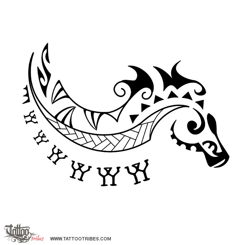 The tail of the lizard (octopus tentacle) and the hammerhead shark motif in the mane (the opposing curls) represent tenacity and adaptability, protection, while the fish hook symbolizes prosperity.