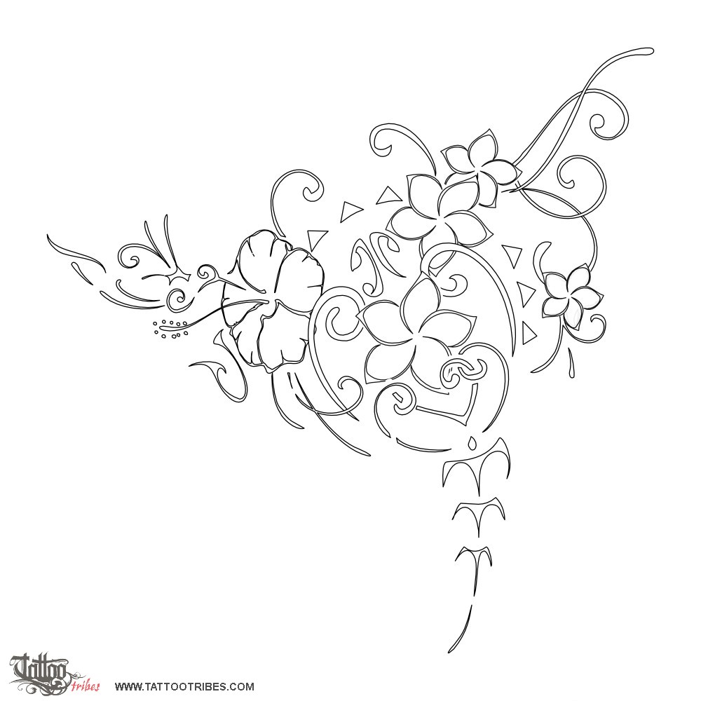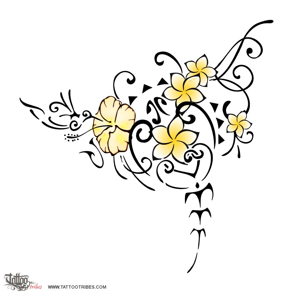 This tattoo was requested by Kristen and it weaves the manta giving the general shape, a turtle, plumeria and hibiscus flowers and a humming bird into a floral design.
