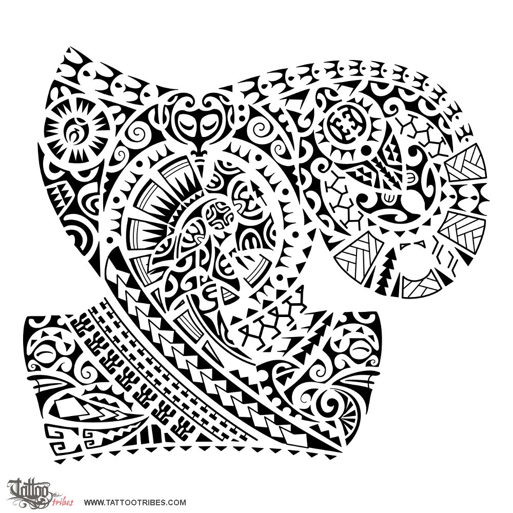 The hammerhead shark protects the harmony and balance reached (the Marquesan cross) with the help of the enata and protected by a lizard in the tail of the shark (good luck).