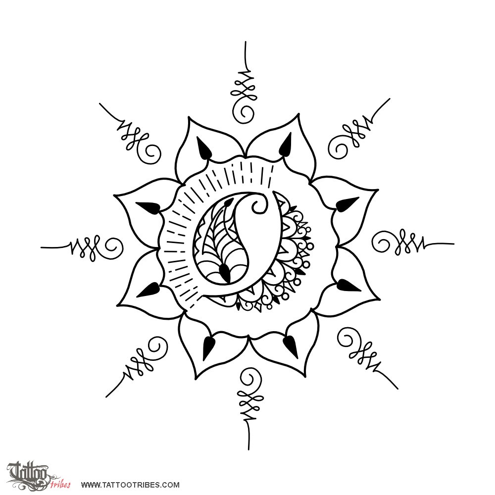 Diana requested this mehndi inspired tattoo of a round lotus flower with 8 petals representing the Buddhist eightfold path.