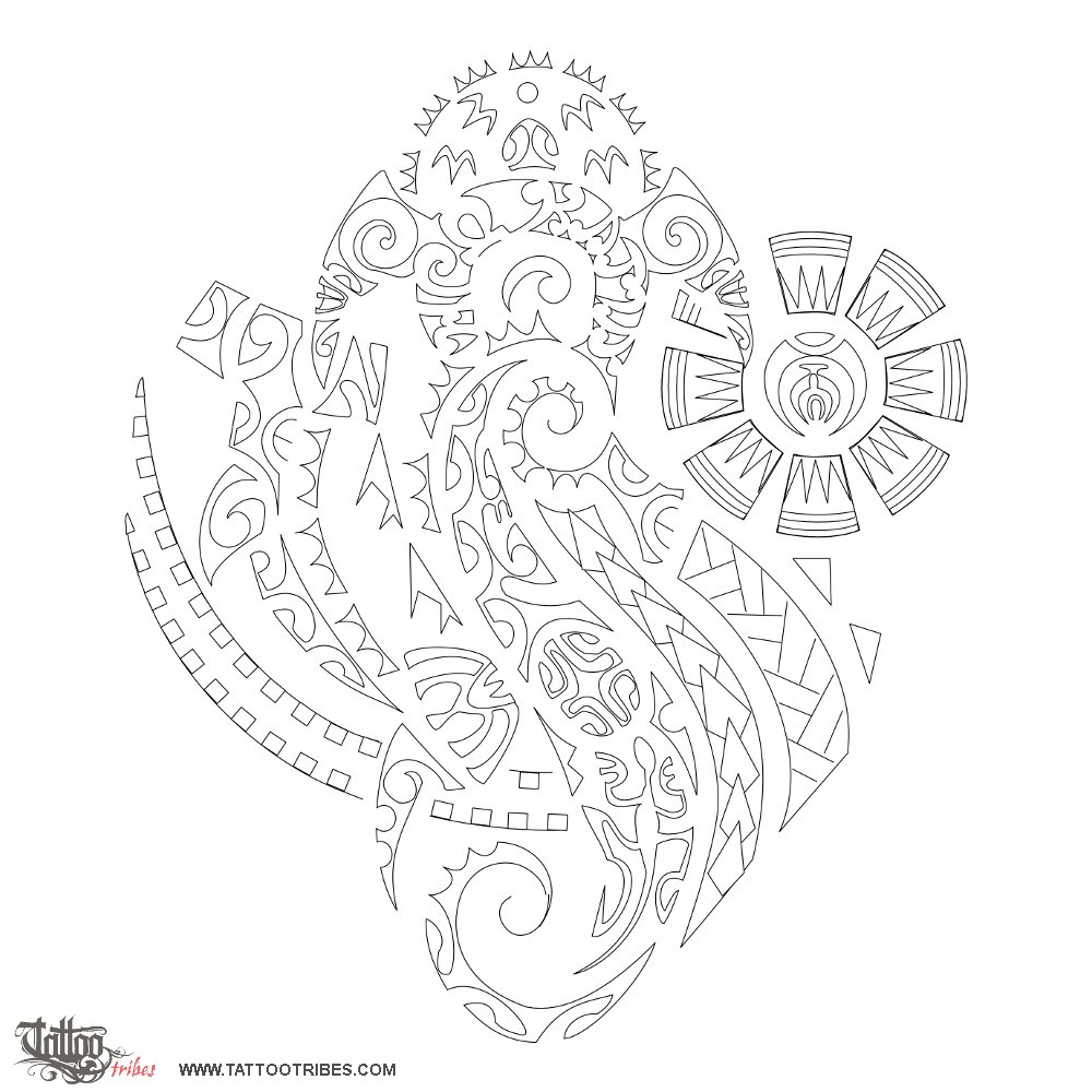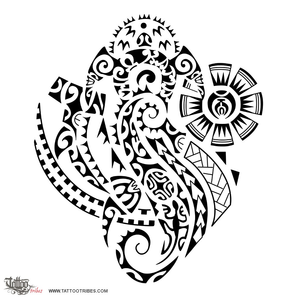 Polynesian tattoos explainedRight in the center of this tattoo requested by Dimitris, along the axis of simmetry from bottom to top, there are a seahorse, a turtle and a sun.