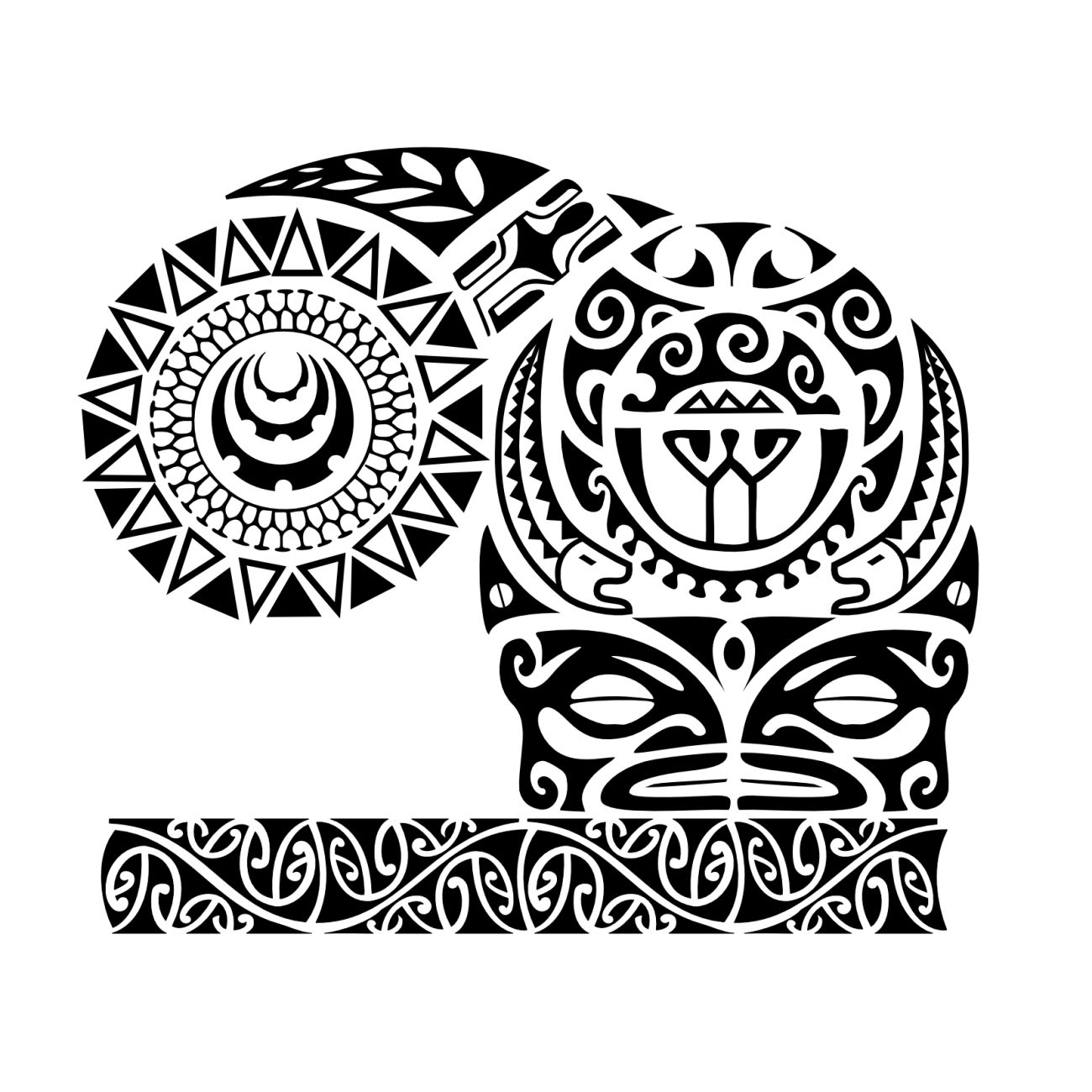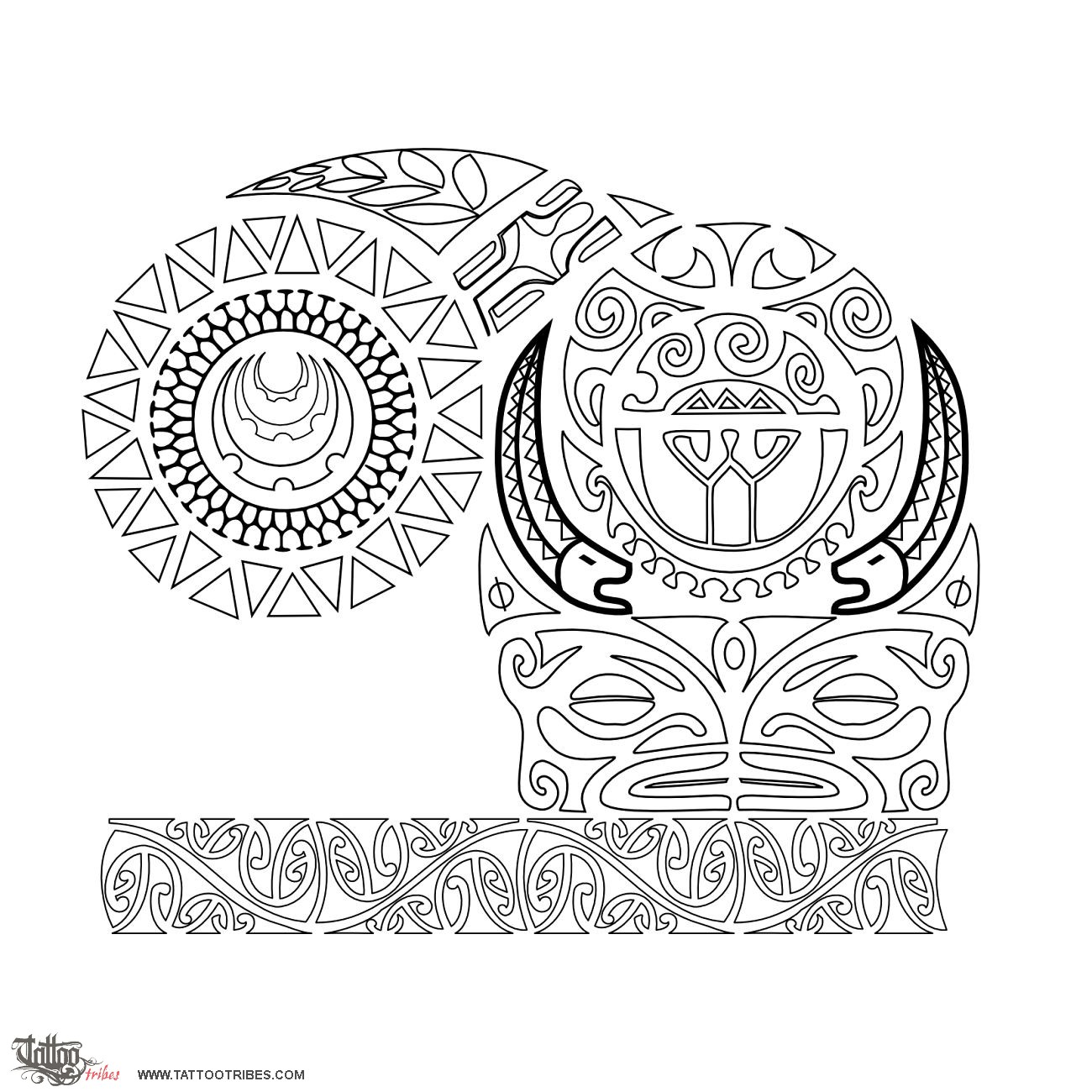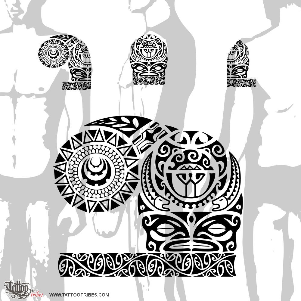 Polynesian tattoos explainedWe called Kaha this desing requested by Bjoern on account of several elements in it that enforce this idea of quiet strength: the traditional hammerhead motif of the armband indicated strength and tenacity, and the eels recall the fight won by the warrior Maui against the giant eel moray Te Tuna. Tikis symbolize fertility and protection, on the sea and on the land, as symbolized by the waves and mountains, a protection coming also from ancestors, whose eyes are on the eels sides. The adult fern leaf indicates maturity, and the fern buds are for the descendants. Other elements symbolize good luck, family, travel and adaptability (lizard, sun, turtle, shark teeth...).