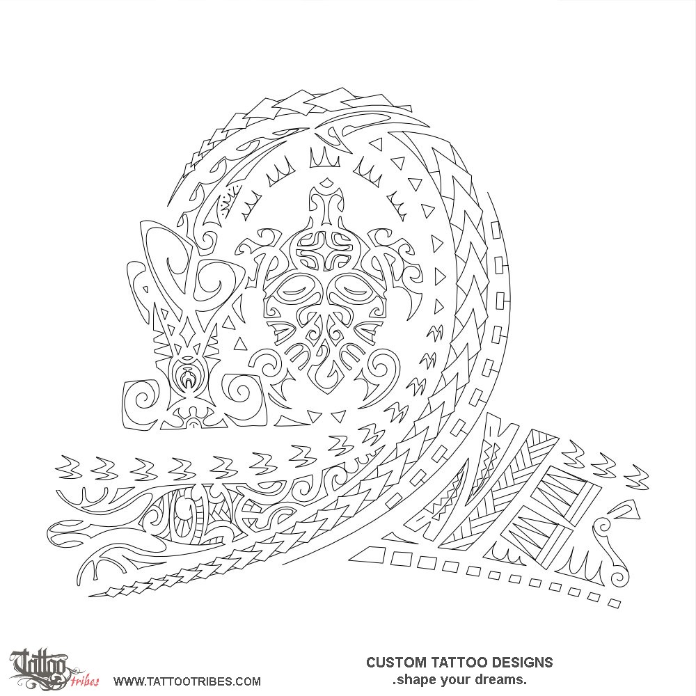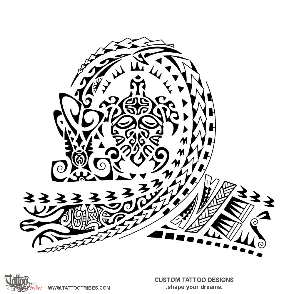 The spear heads and hammerhead shark represent a warrior who leaves adversities behind (the moray eels) and follows his path with tenacity in order to give protection and prosperity to his family (the turtle in the center, with tiki and fish hook on its shell).