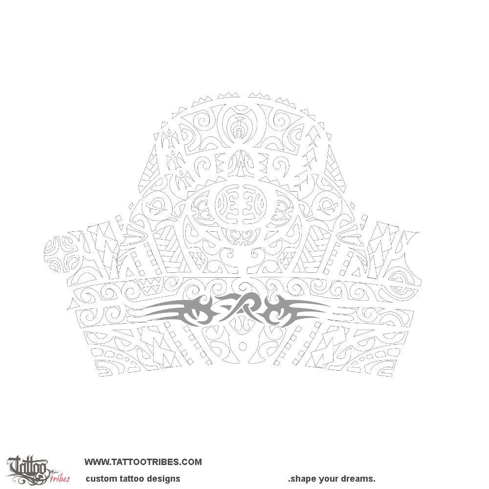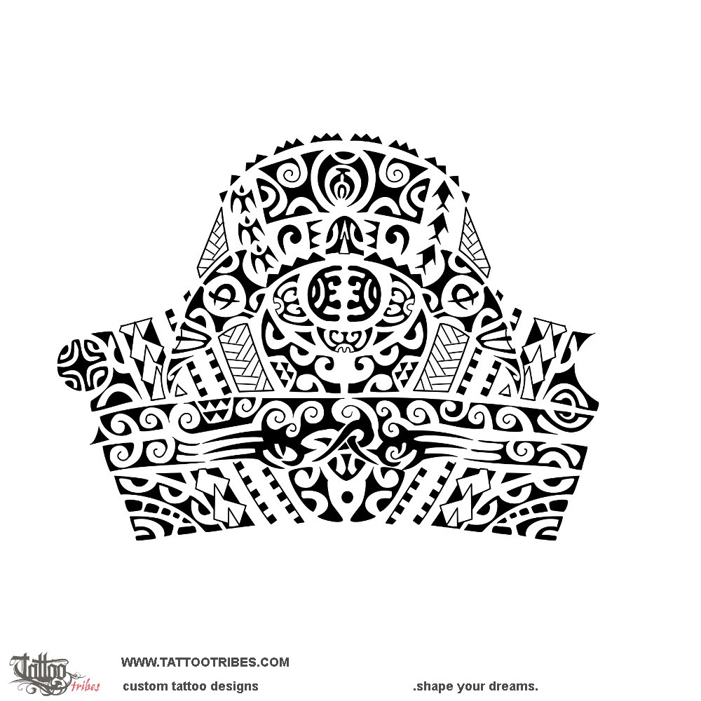 The main elements are the turtle, representing his family, and the hammerhead shark (the warrior protecting them, together with the two tiki on the front fins and with the all seeing eye).