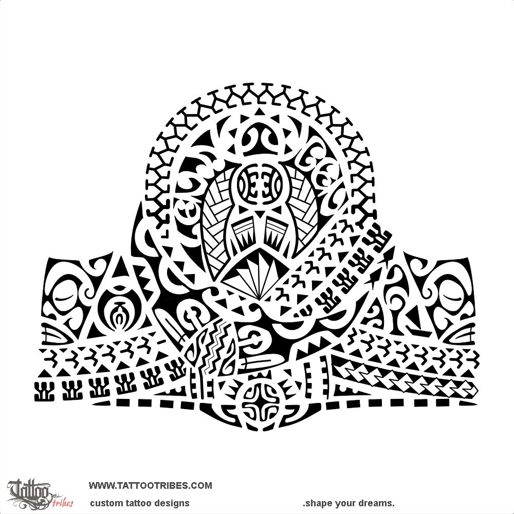 Inside the turtle a couple and a stylized twist, a braid and flax leaves symbolize union and love, with the names of his children inserted in the front flippers as maorigrams.