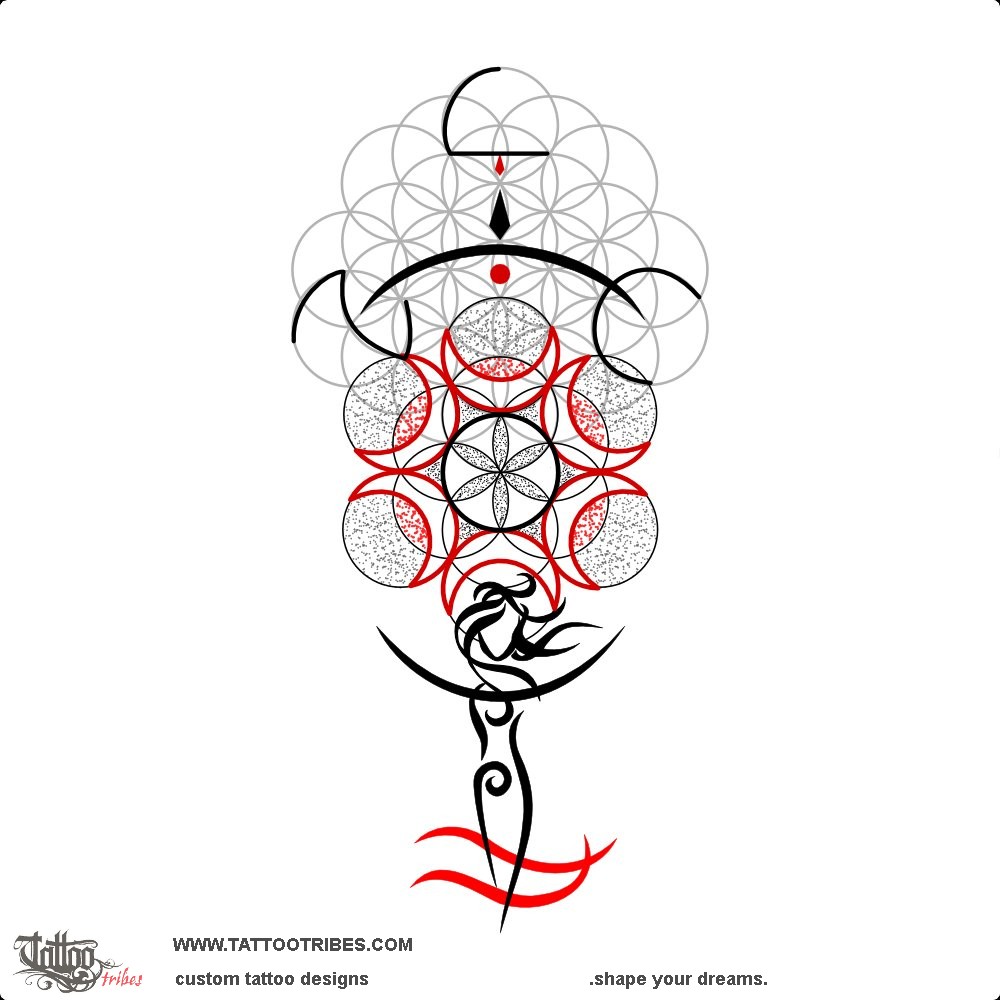 In the complete design the full moon, surrounded by half moons, forms a geometry called sacred seed, symbolizing the seed of life (Selene is also the goddess of fertility).