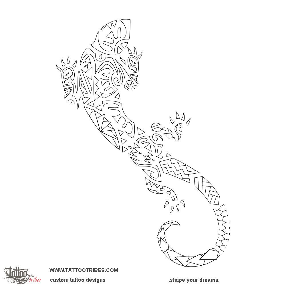 Looking from top to bottom at this polynesian style lizard tattoo designed for John, a warrior can be seen in the head guiding his family, represented by the flax leaves in the left side of the lizard´s body. On the right side, two smaller enata represent his children (they have a small koru nearby to symbolize children and new life) and a bigger enata between them for his wife.