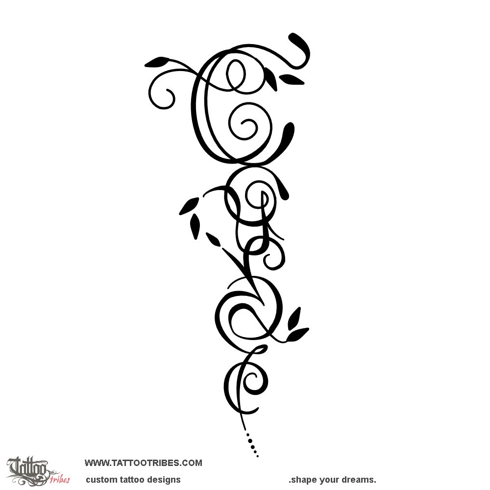 This intricate and feminine tattoo was prepared for Marnie and it renders the word "Courage" using vines, swirls, and myrtle leaves, which represent faithful love.