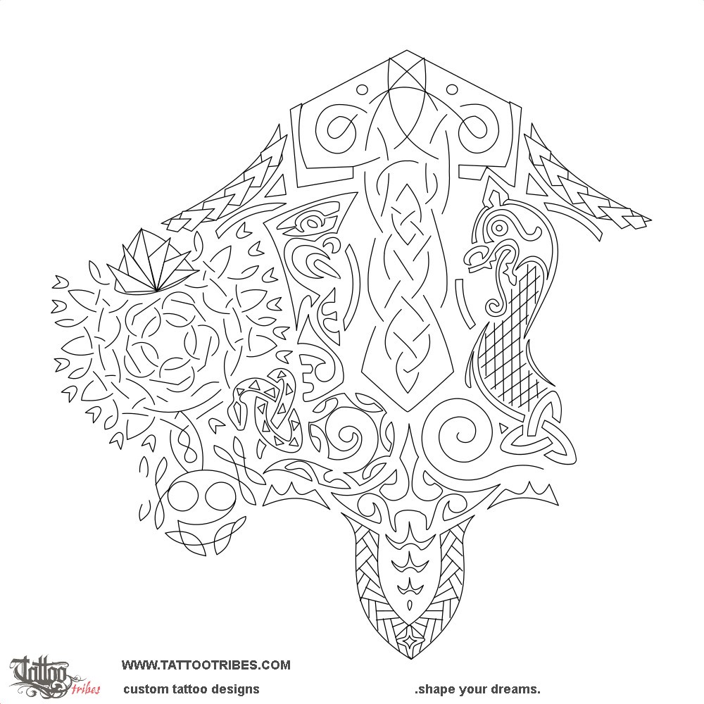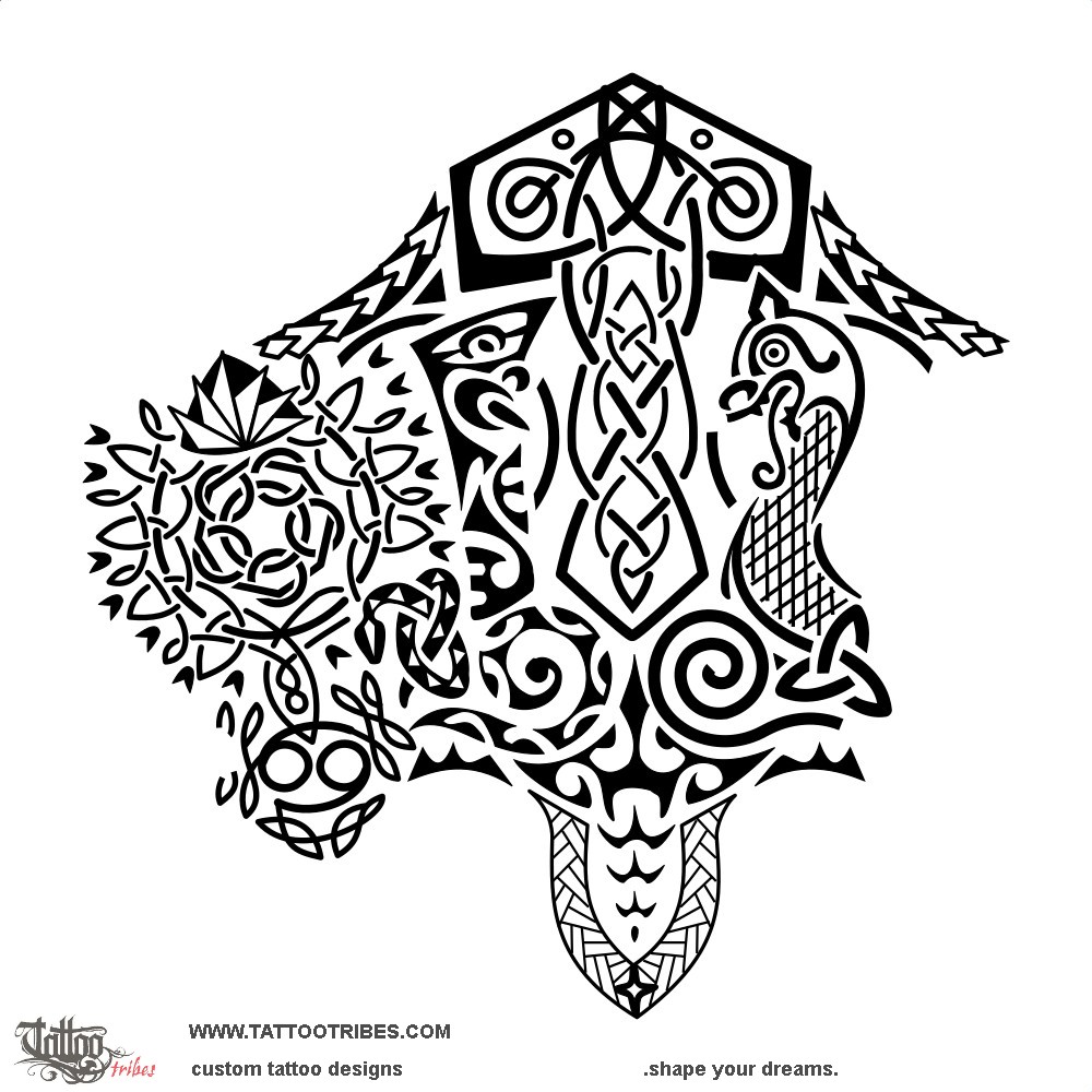 The sacred tree Yggdrasil is on the calf, designed with endless knots in Norse style.